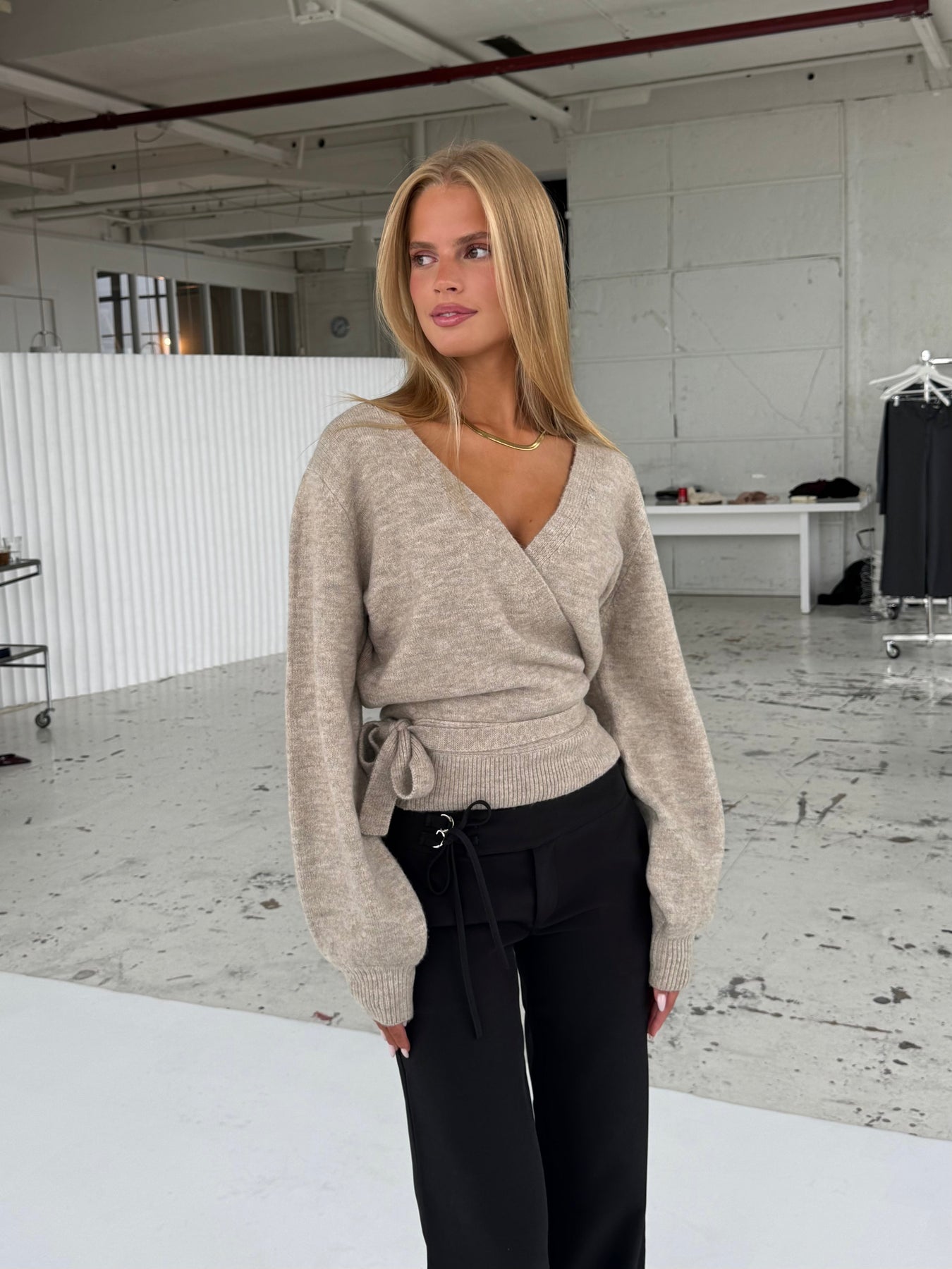 Cardigan i det blødeste materiale, lavet af uldblanding. Ballerina model som bindes i siden og kan strammes ind efter ønske.